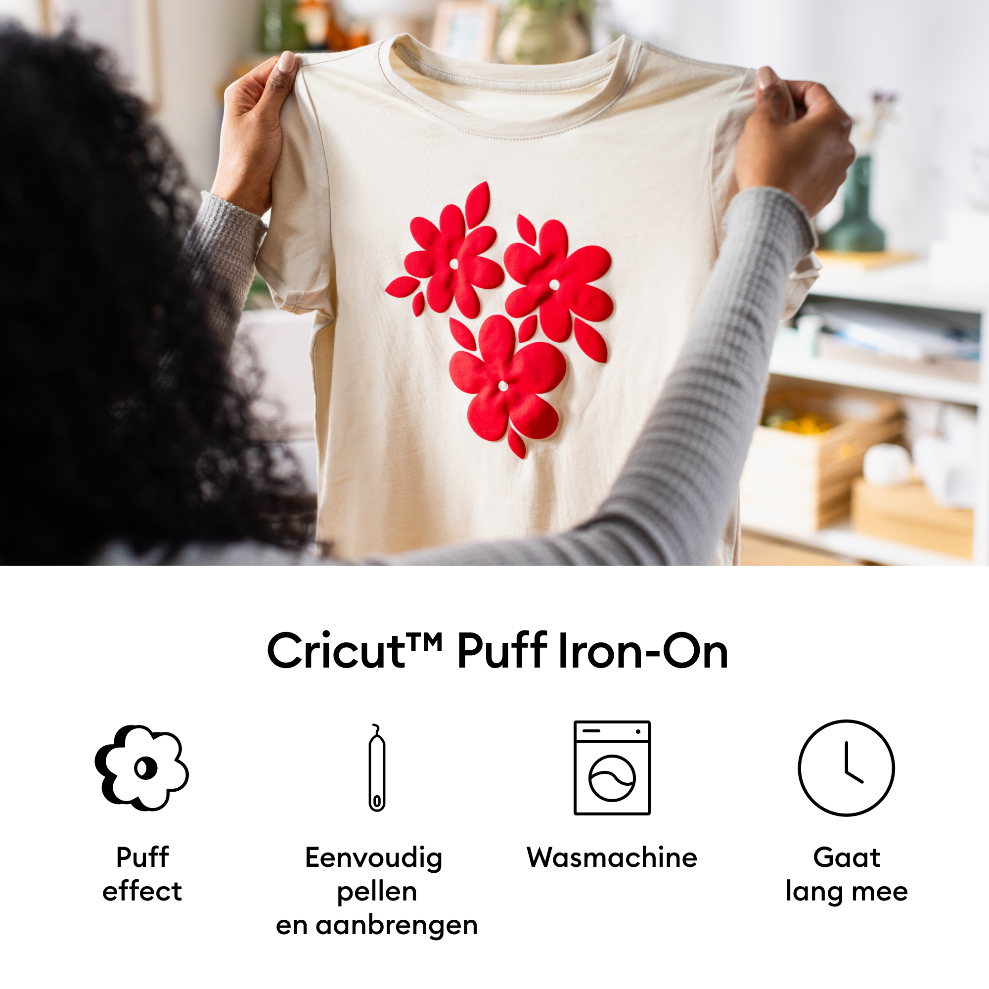 - Cricut Puff Iron-On in wit is een hittegevoelige flexfolie die bij het verhitten opbolt tot een zachte puff-laag.